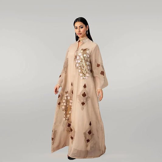 ملابس الحفلات قفطان مشمش مع تطريز ذهبي متطور